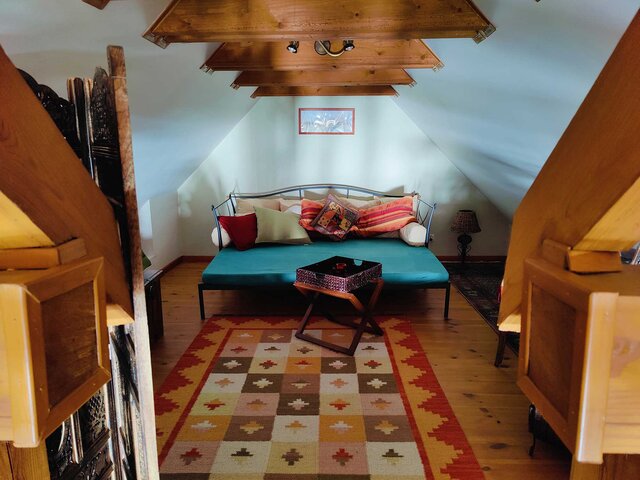 Im ersten Obergeschoss gibt es ein Wohnzimmer mit einem zusätzlichen Mezzanine-Schlafzimmer und ein Badezimmer.